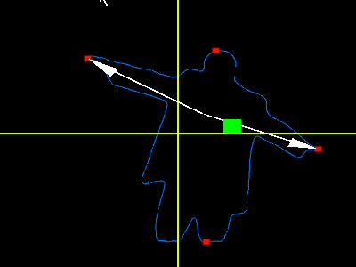 Contour output processed to convert arm angles (white arrows) into joystick X/Y (green quad and yellow axes).